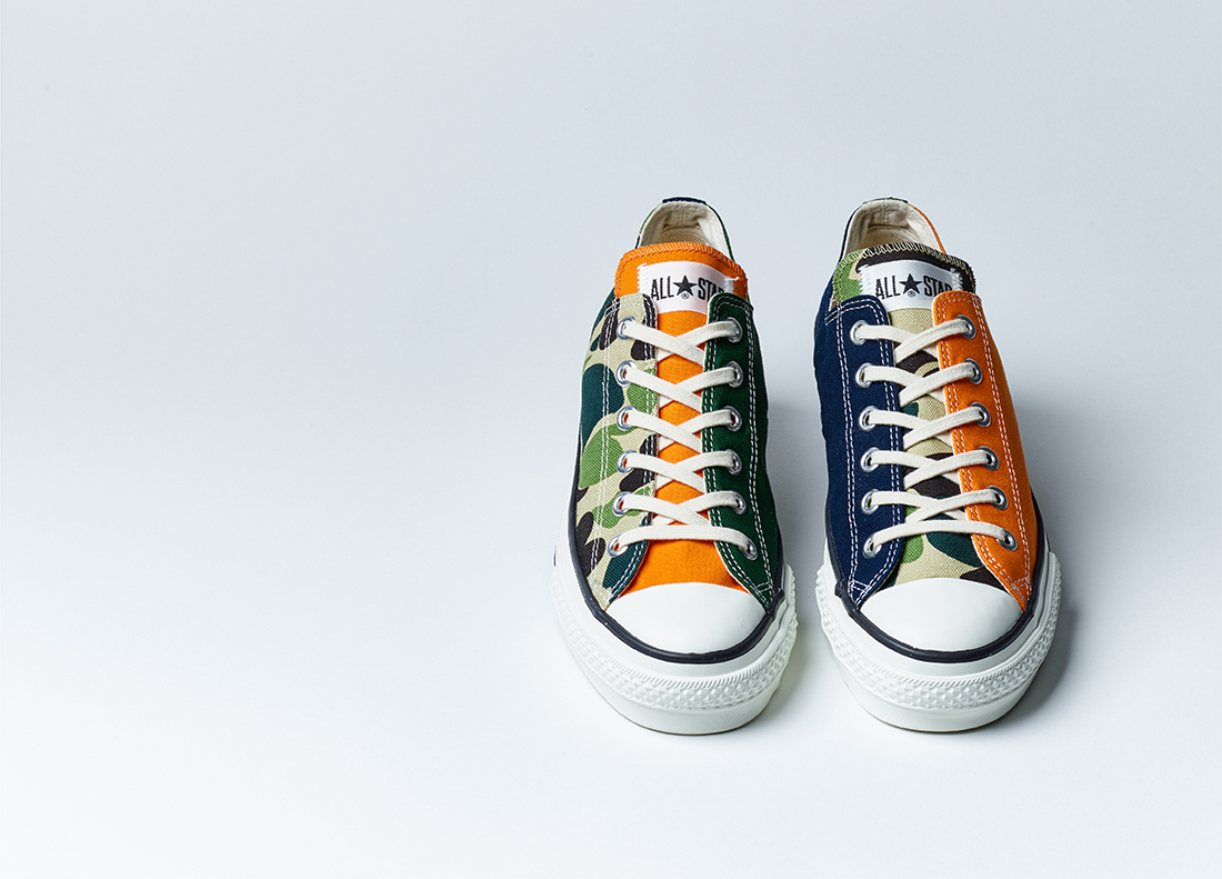 今回の別注は、コンバースの人気マテリアルである「83カモ」を使用しながら、全ての面を異なるカラーで制作。右向きと左向きでは同じ商品に見えないように工夫したデザイン。