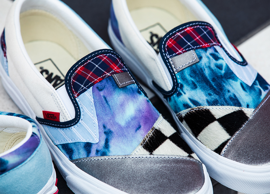 1979年に誕生した名作「CLASSIC SLIP-ON」の 定番スタイルを大胆アレンジ。 アッパーには、シルバーカラーのレザー、タータンチェック、ブルーのタイダイ、白黒チェッカー、スエードをミックス。アウトソールは左右で異なる色で仕上げ、細部まで遊び心を感じる1足。