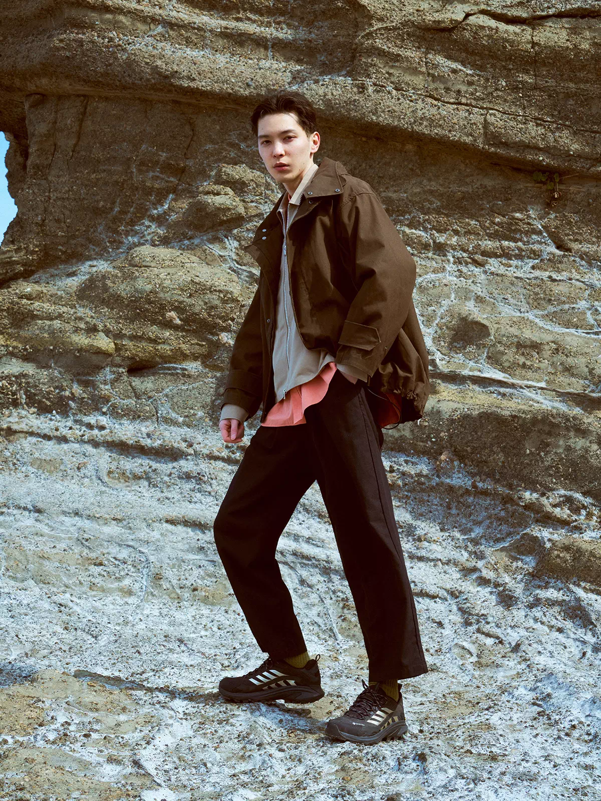 「ボリュームがあるスニーカーなので、ややワイドめなシルエットでバランスを取りました。ポイントとしては、カジュアルになりすぎないようにスラックスできれいに仕上げ、アースカラーでまとめたところです。またハリのあるシェルジャケットとジップシャツをゆったりとさせて裾を絞り気味にしたことで、丸みを帯びたコーディネートを意識しています」