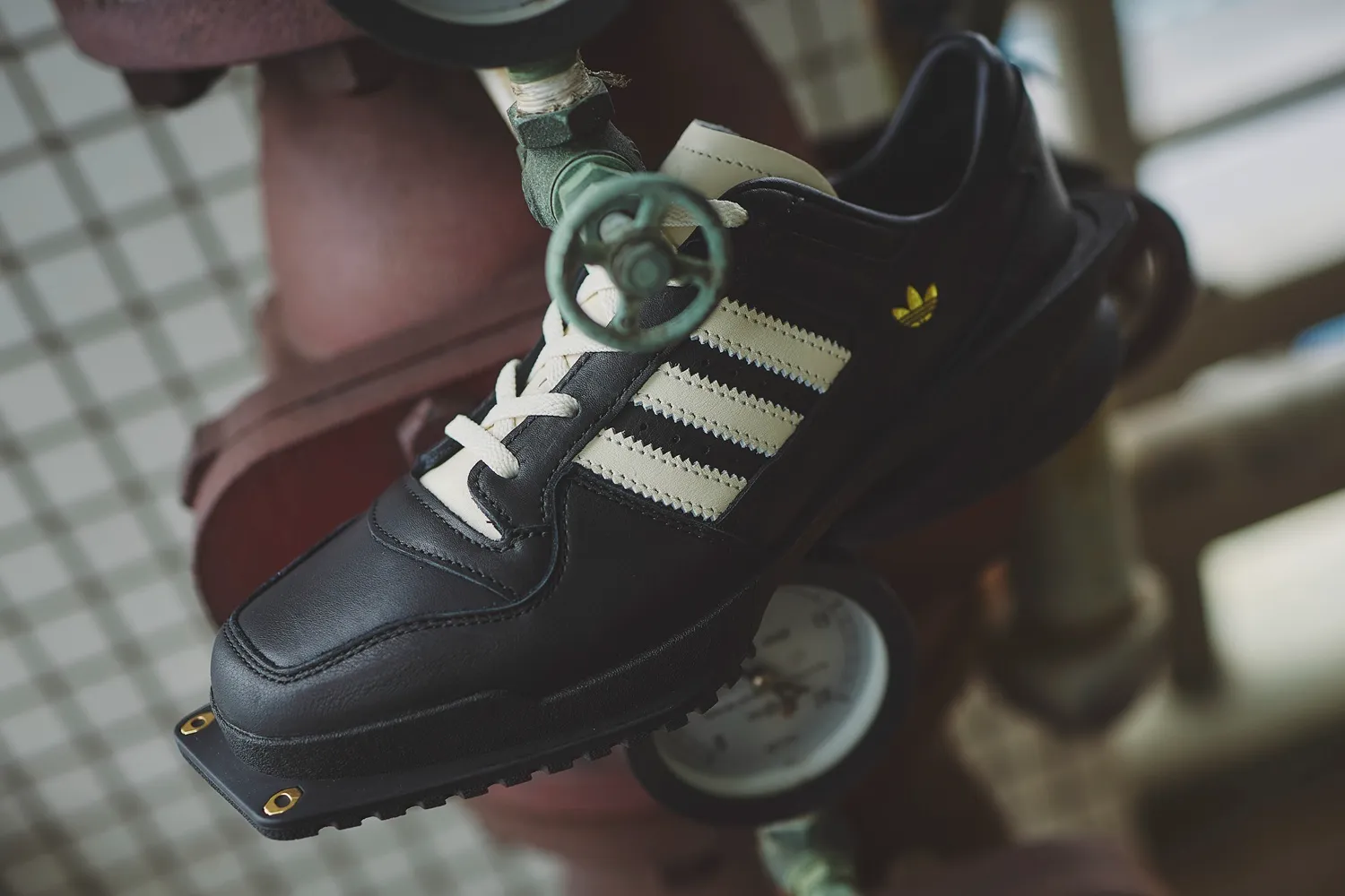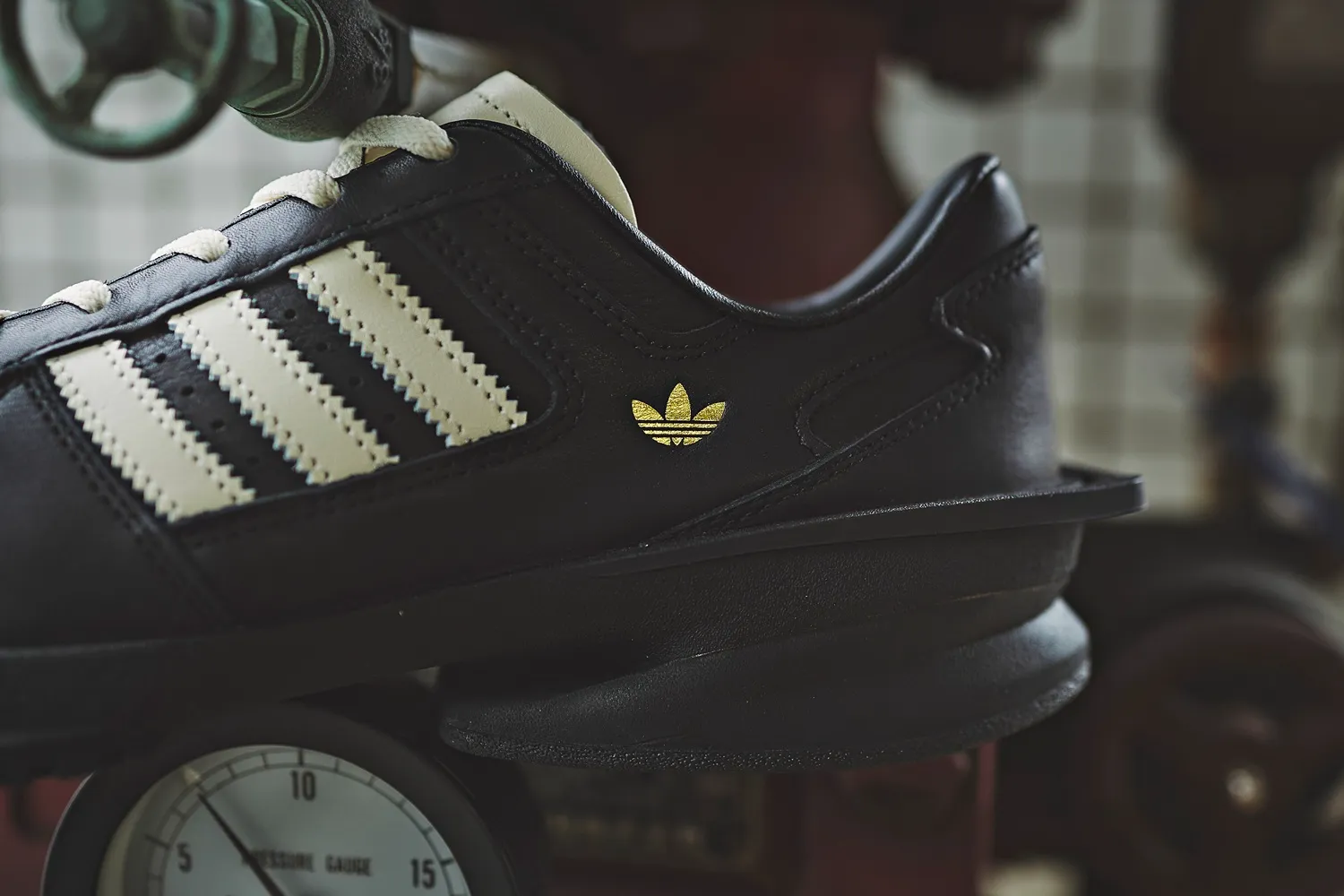 つまさきのラバーに配したアイレットやトレフォイルのプリントに配したゴールドがアクセントに。